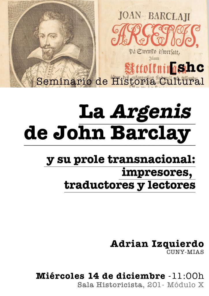 - 14 de diciembre: Adrian Izquierdo (CUNY-MIAS), “La Argenis de John Barclay y su prole transnacional: impresores, traductores y lectores”