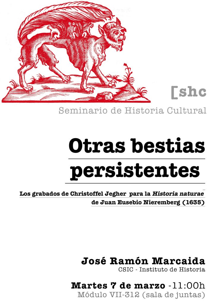 - 7 de marzo: José Ramón Marcaida (CSIC): “Otras bestias persistentes. Los grabados de Christoffel Jegher para la Historia naturae de Juan Eusebio Nieremberg (1635)