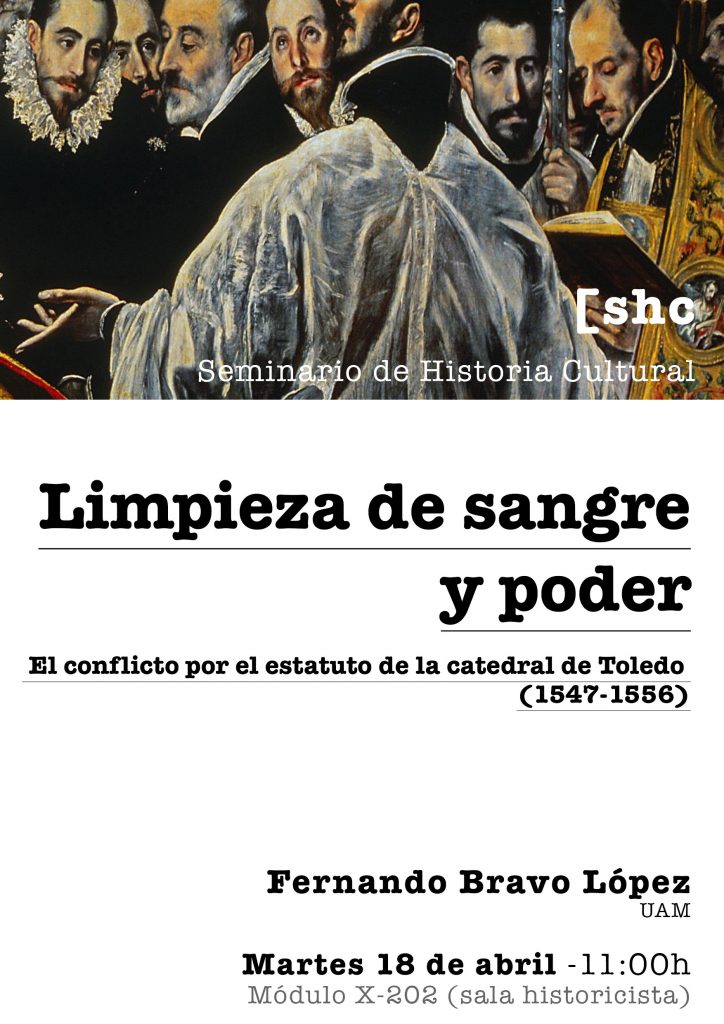 - 18 de abril: Fernando Bravo López (UAM): “Limpieza de sangre y poder. El conflicto por el estatuto de la catedral de Toledo (1547-1556)