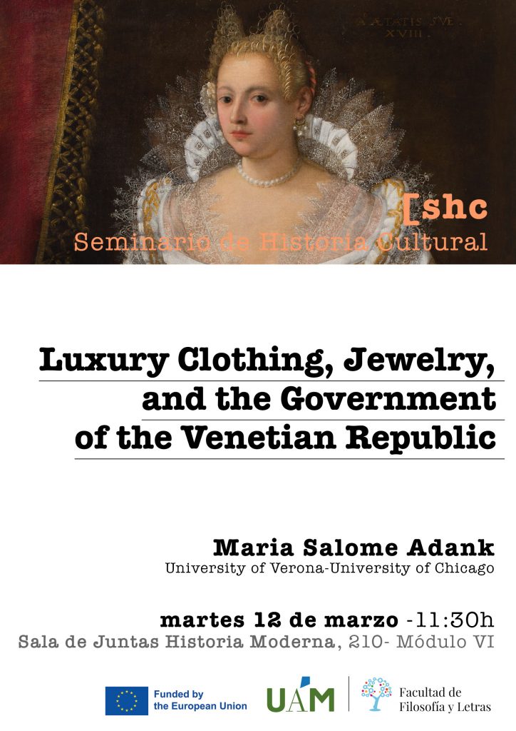 12 de marzo de 2024: Maria Salome Adank, “Luxury Clothing, jewelry and the government of the Venetian Republic”, 11:30 horas, sala de Juntas de Historia Moderna (210, módulo VI)